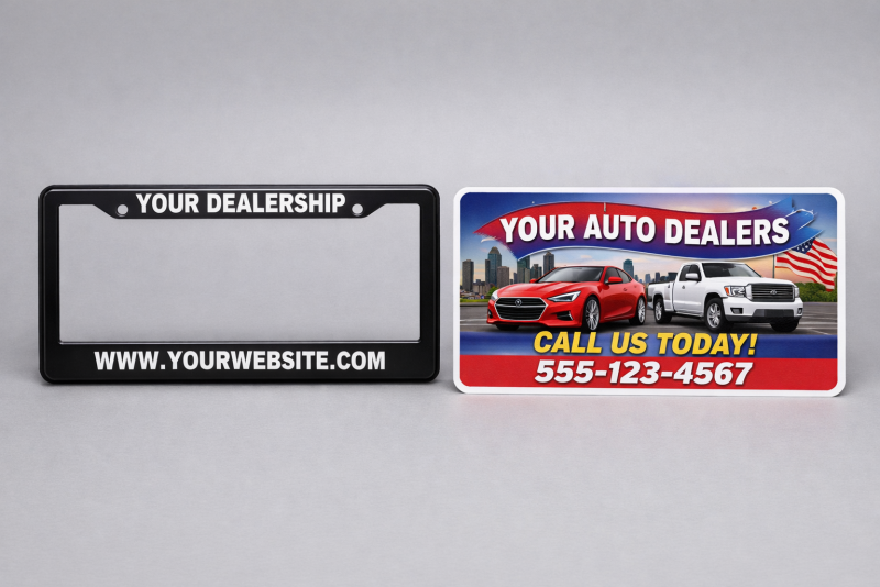License plate frames, full color inserts, and dealership branding products designed to keep your name on every vehicle you sell.